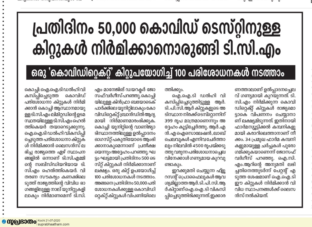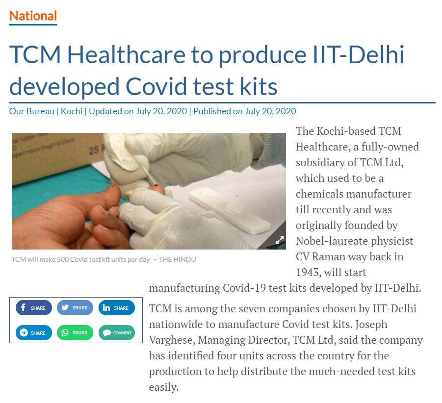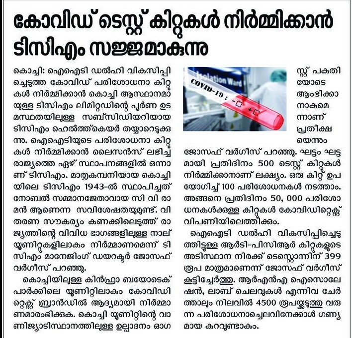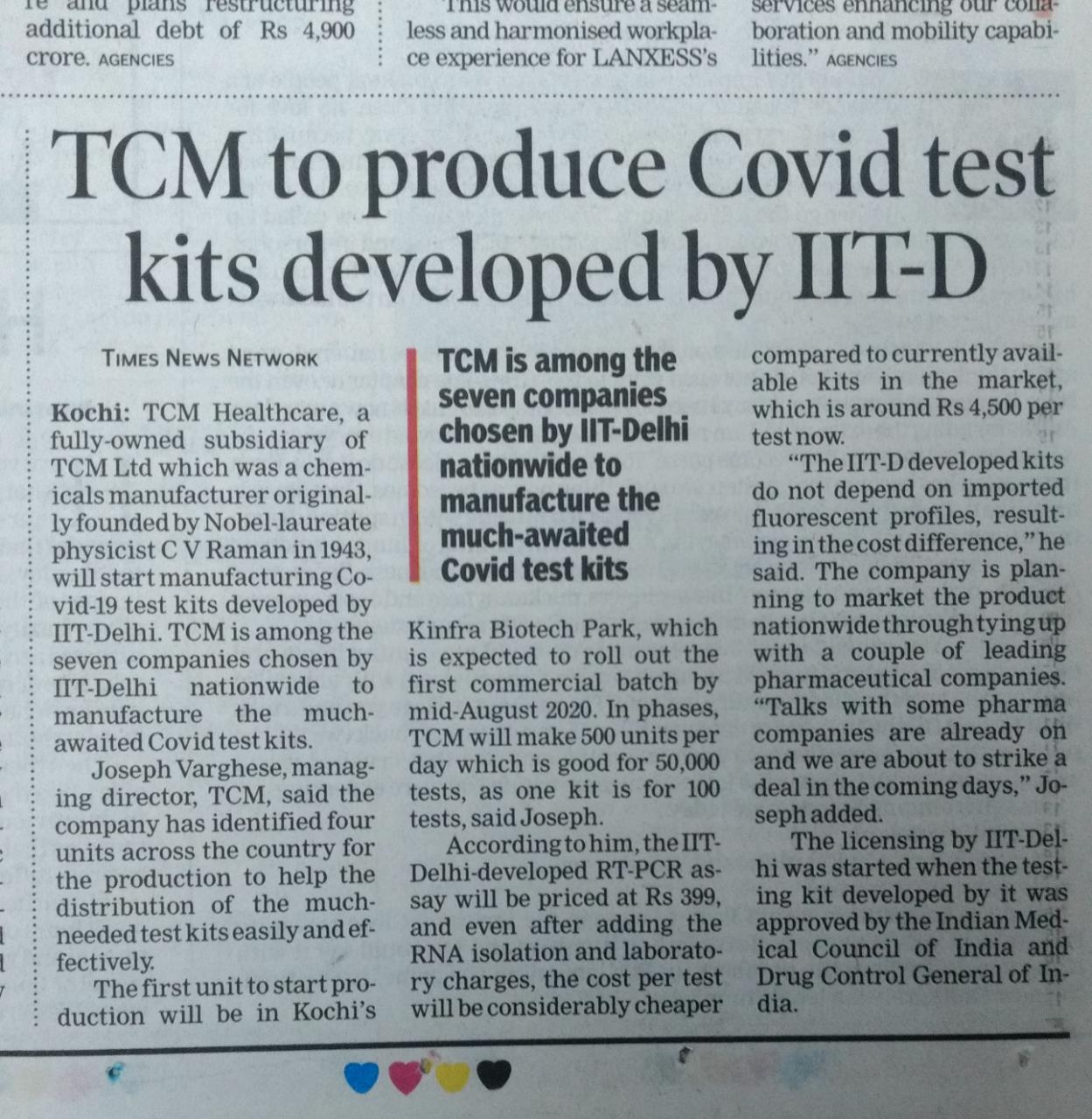 KOCHI: Kochi-based TCM Healthcare, a fully-owned subsidiary of TCM Ltd, which used to be a chemicals manufacturer till recently and was originally founded by Nobel-laureate physicist C V Raman way back in 1943, will start manufacturing COVID-19 test kits developed by IIT Delhi. TCM is among the seven companies chosen by IIT Delhi nationwide to manufacture the much-awaited COVID test kits.